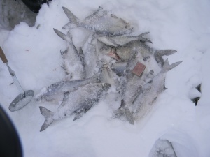 Итог: 3,5 кг экологически чистой съедобной рыбы. Обратная дорога оказалась намного легче, прошел залетный Буран дошли по его следу, повезло